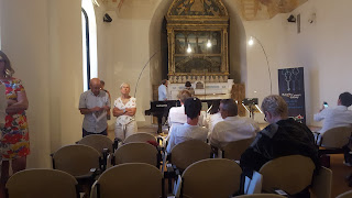Our dinner was sandwiches, bought in a store and eaten on a bench just off the main square. Then we went down a long flight of stairs to a former chapel that was now a concert venue, where we heard a concert by a string trio--okay, but not great.