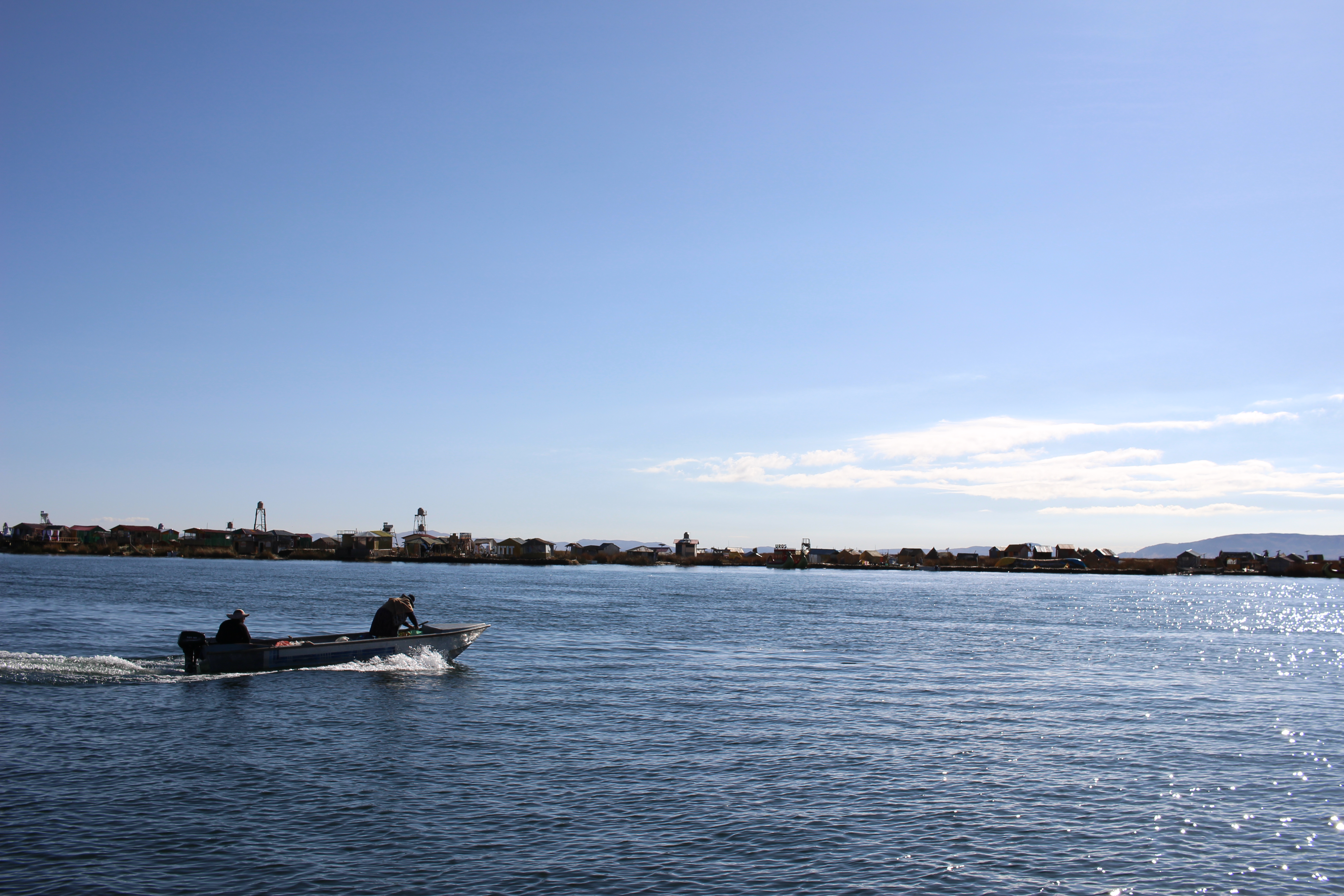 We went to Puno's port area, where we got on a boat and headed out onto Puno Bay, toward Uros Island, where the floating islands could be found. These are made out of many layers of reed mats, on top of root balls, which keep the mats afloat, along with buildings on them. These "islands" are anchored to keep them in place. We landed on one of them, called Pachamama, where we were met by its chief and his family and neighbors, living in a small collection of huts. He showed how the island was constructed and how they lived there. Then we visited his hut and were decked out in typical clothing.We got back onto our group's boat and headed out of the bay onto the great lake, which Peru shares with Bolivia. On the way, we got a chance to sit in the captain's seat.